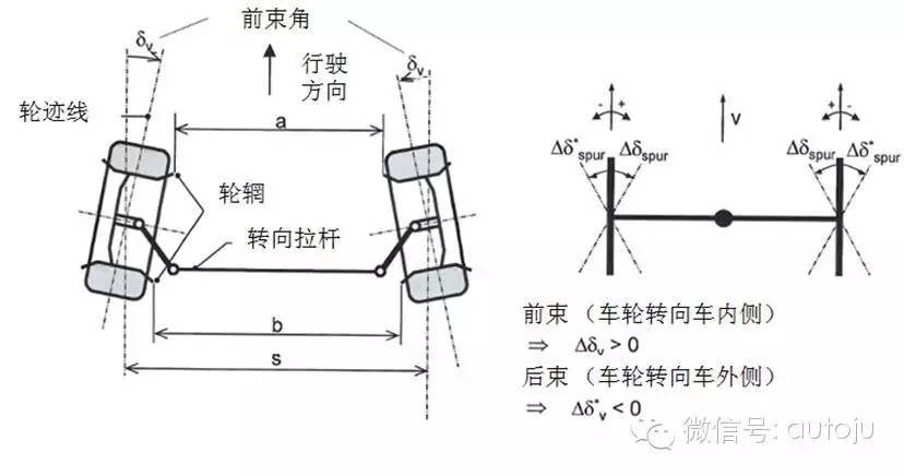 前束,指左右两侧车轮轮辋前端与后端的差值,如下图中,V=b-a。前束角,是轮迹线(车轮平面与地面的相交线)和车辆纵向轴线的夹角。前束和前束角可以通过车轮轮辋半径换算。