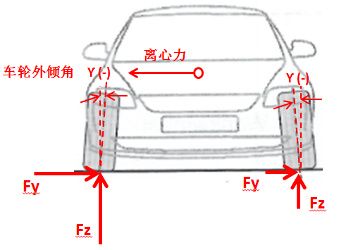 如图5的车辆,向右转向。车辆受到向左的离心力,左侧车轮承受路面垂向作用力Fz大于右侧车轮。因此左轮提供侧向力Fz的潜力大于右侧车轮,重点考察左轮。左轮负的外倾角,使轮胎与路面间产生更大的侧向力Fy,保持车辆稳定行驶。因此目前多数乘用车采用负的车轮外倾角,常见的车轮外倾角为0~-2°。