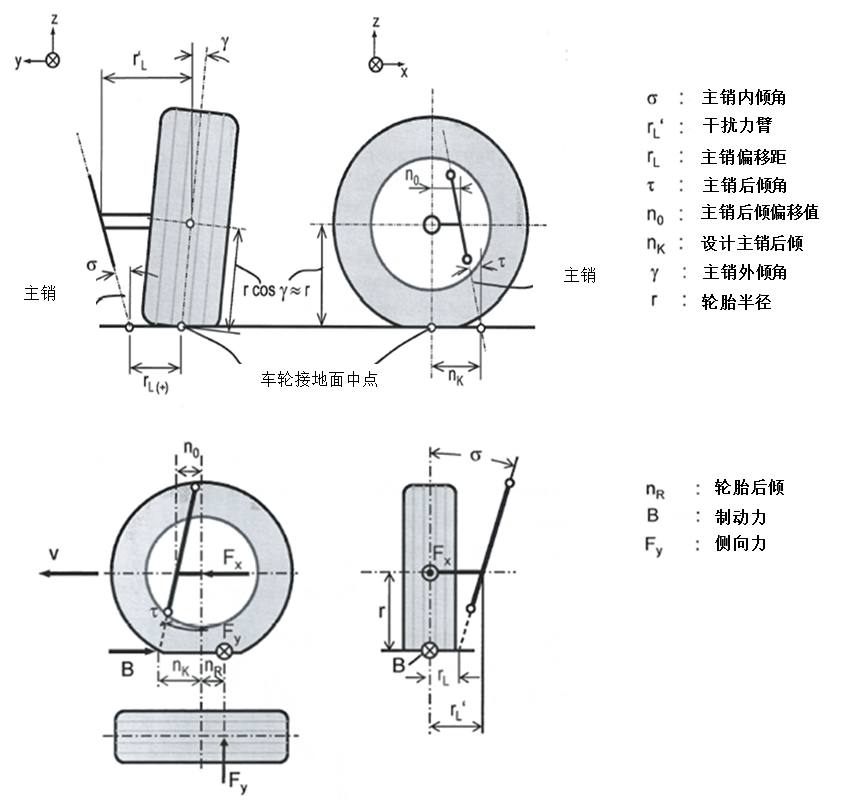 主销偏移距rL,在y-z平面内,车轮接地面中心与主销延长线和地面交点的距离。当主销延长线和地面交点在车轮中心平面外侧,是负值。设计底盘时,尽量选择中性或者略微负值的主销偏移距,以便当两侧车轮制动力不平衡时,能够使车辆自动平衡。
