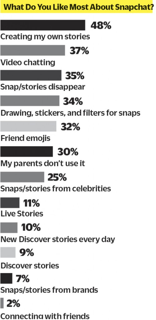 还有一点看起来十分有趣,Snapchat上的用户对这种对自动销毁的内容似乎十分不舍,并且有35%的用户都认为这是让他们持续使用这一平台的主要原因。