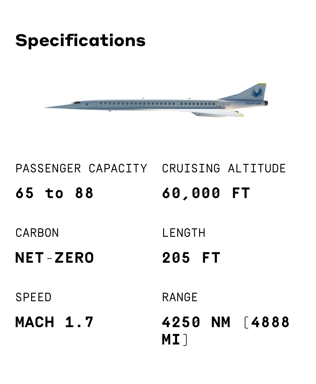 所谓超音速客机,是指其速度快于音速的民航客机,Boom官网显示,Boom Overture 能够搭载65-88名乘客,巡航速度达到1.7马赫,是当今最快飞机速度的两倍,航程范围为4250海里,采用全商务舱布局,加入座椅娱乐屏幕、充足的个人空间和非接触式技术等功能。