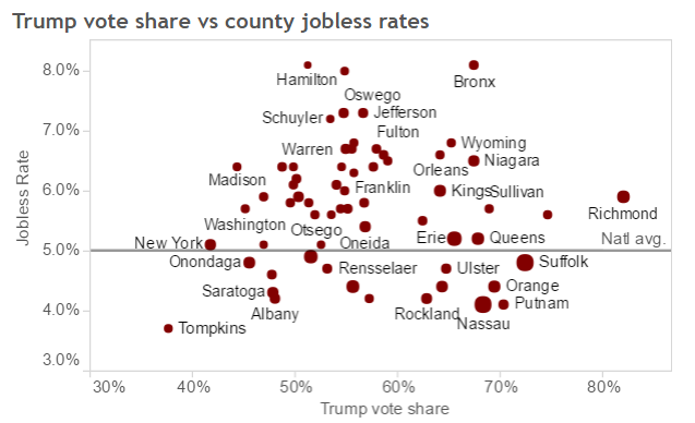 周三,特朗普以超过60%的得票率在纽约州初选中取得压倒性胜利。统计显示,该州62个郡当中有46个失业率高于平均水平。尽管全州整体失业率为4.8%,但纽约州就业市场复苏并不均衡。汤普金斯郡(Tompkins)的失业率为3.7%,而乡村地区汉密尔顿郡(Hamilton)的失业率高达8.1%。