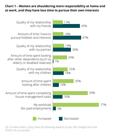 调查认为,造成女性难以保持工作和生活平衡的主要原因在于工作和家庭负担的双重加重。有77%的全球受访者和74%的中国受访者表示工作量在疫情期间有增加;66%的全球受访者和50%的中国受访者认为自己在完成家务/家庭照料事务上所花费的时间比疫情前更多。
