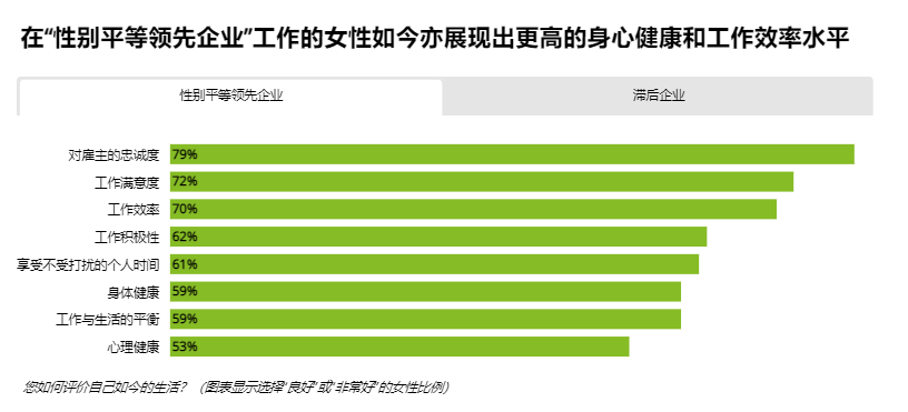 数据显示,在性别平等方面领先的企业,女性在身心健康和工作效率方面均表现优秀。在工作满意度上,认为为“良好”或“非常好”的女性比例达到了72%;心理健康的女性比例为53%,均远高于平均水平。