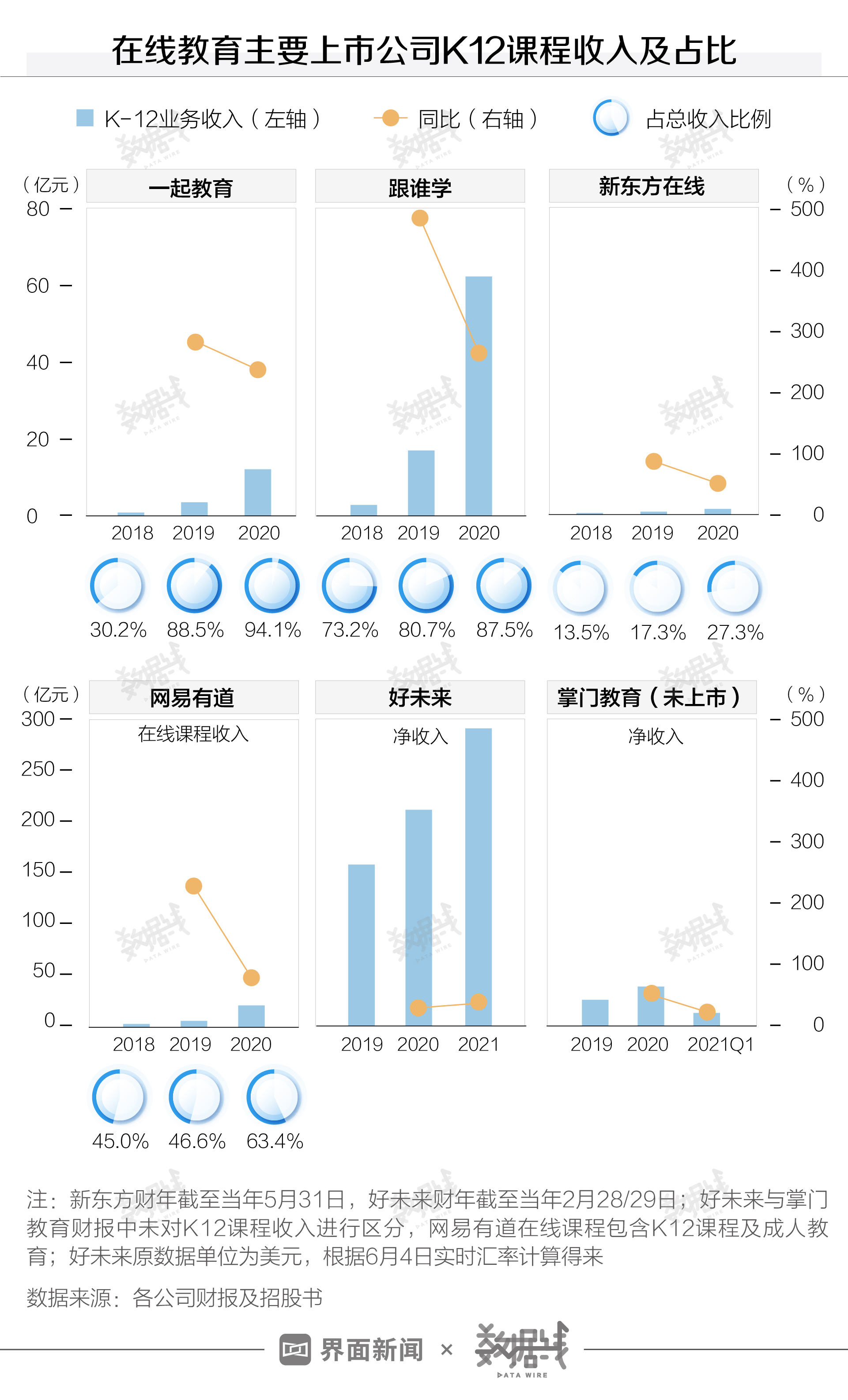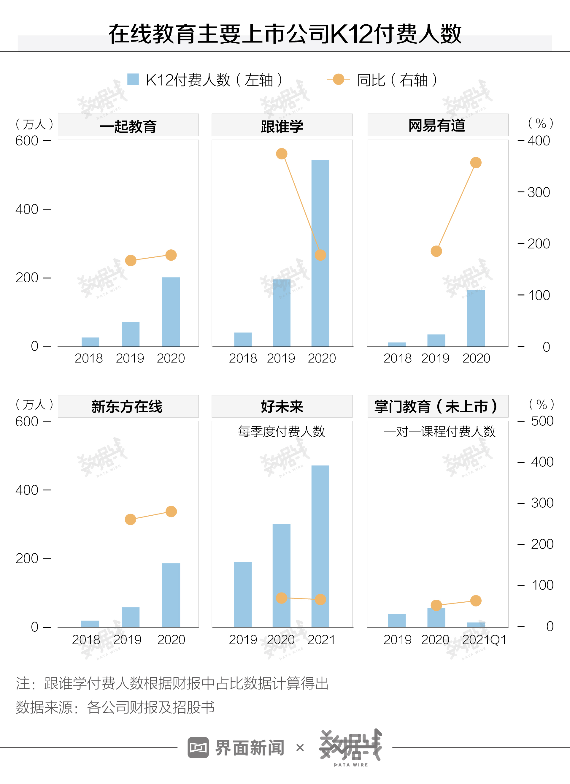 界面数据选取了2020年在线教育行业市值前4名的企业(好未来、跟谁学、新东方在线和网易有道)和2家头部企业(一起教育、掌门教育)进行分析。