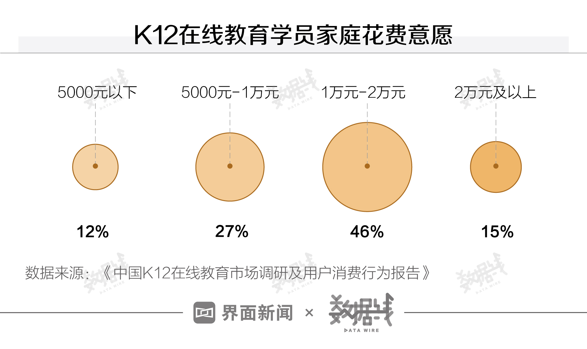 家长愿意为孩子教育花多少钱?上述报告显示,6成以上家长愿意每年花费超1万元用于孩子的K12在线教育,27%的家长愿意每年花5000元到1万元。