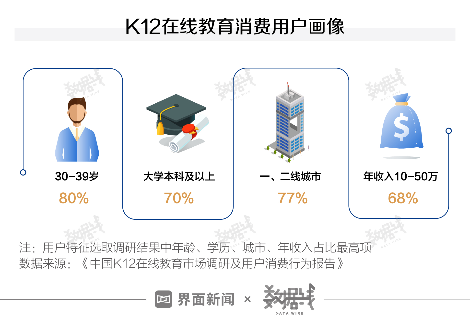 据《中国K12在线教育市场调研及用户消费行为报告》,30岁至49岁的人群是给孩子报线上学习班的主力军,占比80%。70%的家长有本科及以上学历。目前,在线教育的消费人群7成以上集中在一二线城市,近7成家庭年收入在10万元到50万元之间。