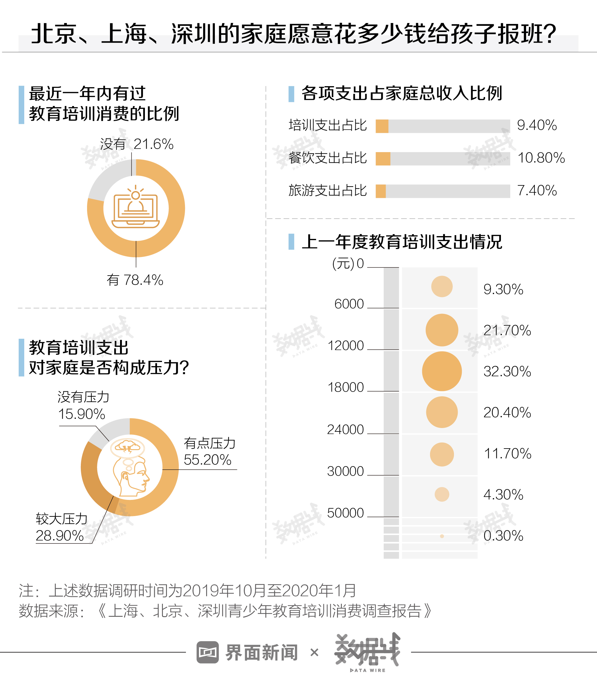 一线城市家庭中,每年花1万元给孩子报班已经是普遍现象。上海市消保委2020年3月发布的《上海、北京、深圳青少年教育培训消费调查报告》显示,北京、上海、深圳共有78.4%的家庭在最近一年中有过教育培训消费。孩子教育培训的平均年支出约为1.6万元(不含学历教育),占家庭总收入的9.4%,超过旅游支出占比,接近餐饮支出占比。8成以上的家庭都表示给孩子报班有一定经济压力。