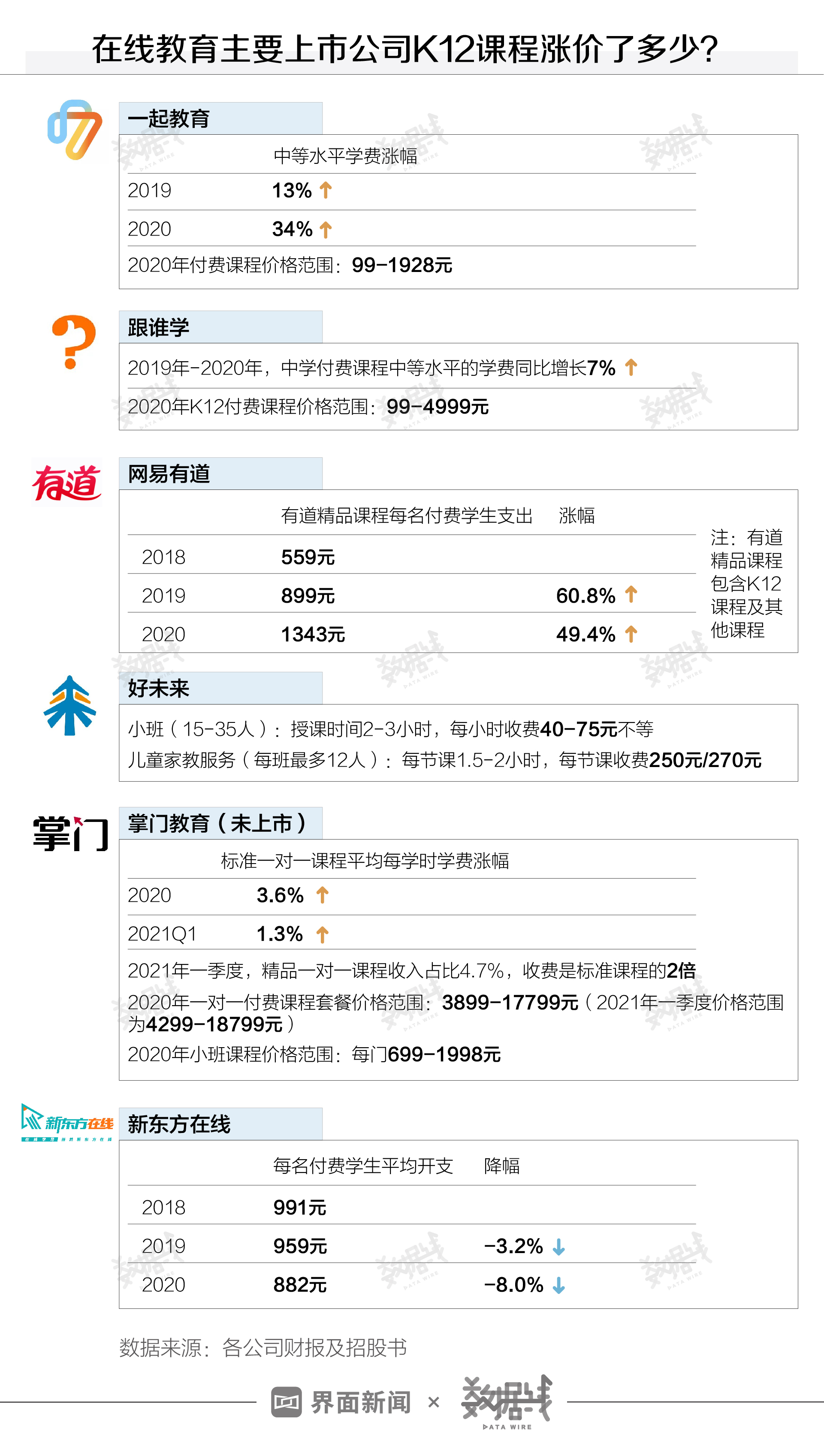 家长们报班很疯狂,费用也越来越高。目前,各公司K12付费课程定价从几百元到几千元不等,部分课程价格达上万元。以市值最高的好未来为例,其小班教育每小时收费在40元到75元不等,按一节课2小时计算,每节课最高收费150元。儿童家教服务更贵,每节课收费在250元至270元。掌门教育还推出了一对一付费课程“套餐价”,2021年一季度该价格为4299元至18799元。财报显示,掌门教育每6个月会提高一对一课程的标准学费,一起教育每6到12个月会提高一次学费。2020年,6家公司中有4家学费上涨,其中一起教育学费涨幅最高,2020年中等水平学费上涨34%。2020年网易有道精品课程付费学生人均支出达1343元,同比增长近5成。