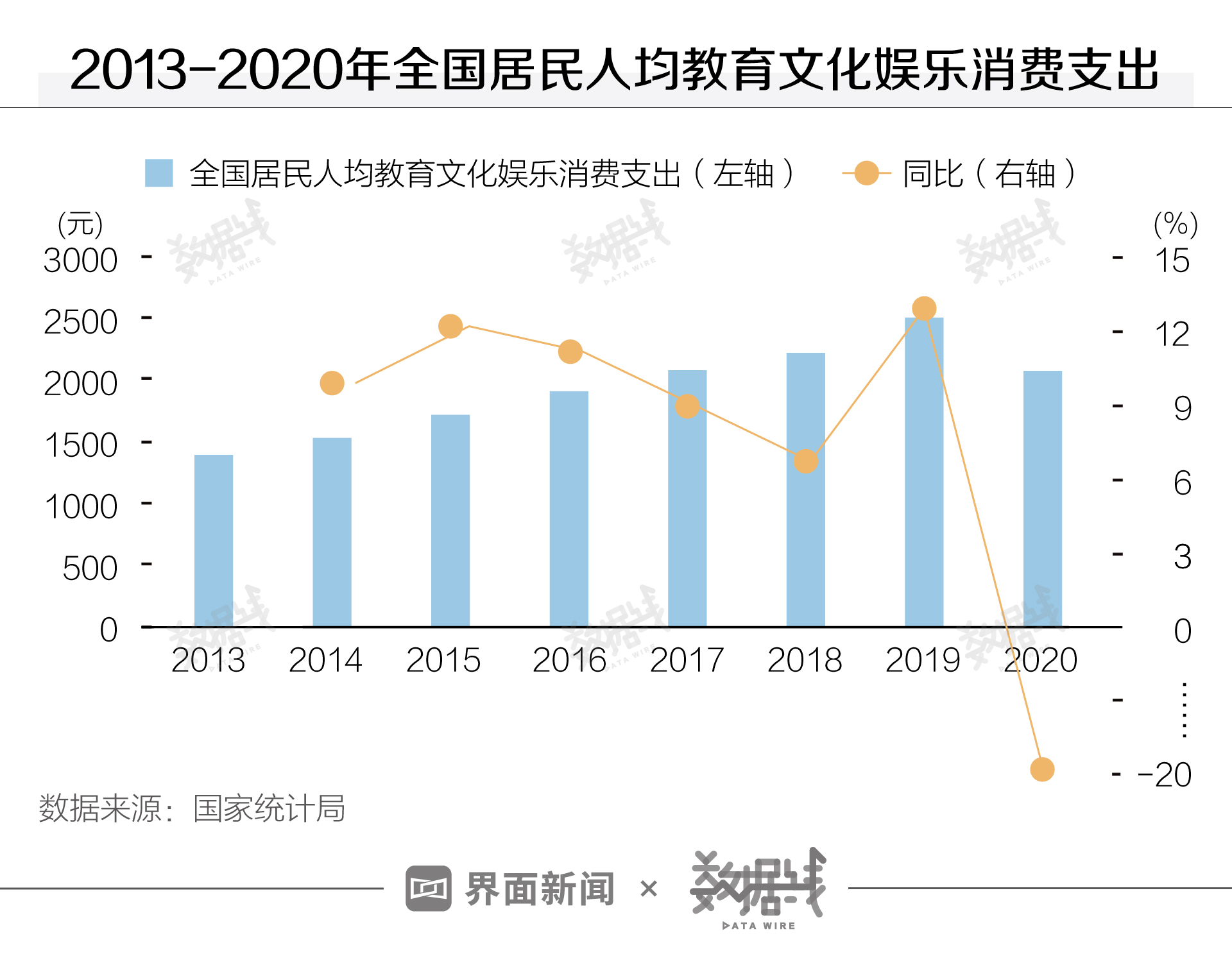 据国家统计局数据,2013年至2020年,全国居民人均教育文化娱乐消费支出从1398元增长至2032元,8年上涨45.4%。据界面数据统计,剔除2020年疫情影响,2013年至2019年涨幅接近80%。