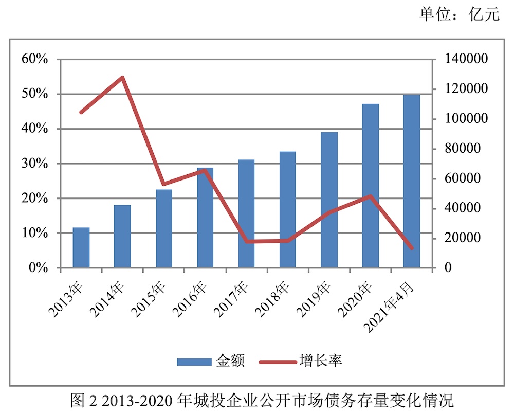 2017-2018年,由于监管部门对城投企业监管持续收紧,城投企业债务上升势头得到一定程度遏制,债务余额年均增长率由2016年的28%降至2017年和2018年的8%。然而,2018年下半年以来,由于经济下行压力持续加大,叠加中美贸易摩擦影响,对城投企业的监管也开始出现边际放松,城投企业债务规模也再度开始大幅扩张。截至2020年末,城投债余额为10.9万亿元,比2018年末上升了37%。2021年以来,城投企业融资规模继续上升。截至2021年4月末,城投债余额为11.62万亿元,比2020年末上升了6%。