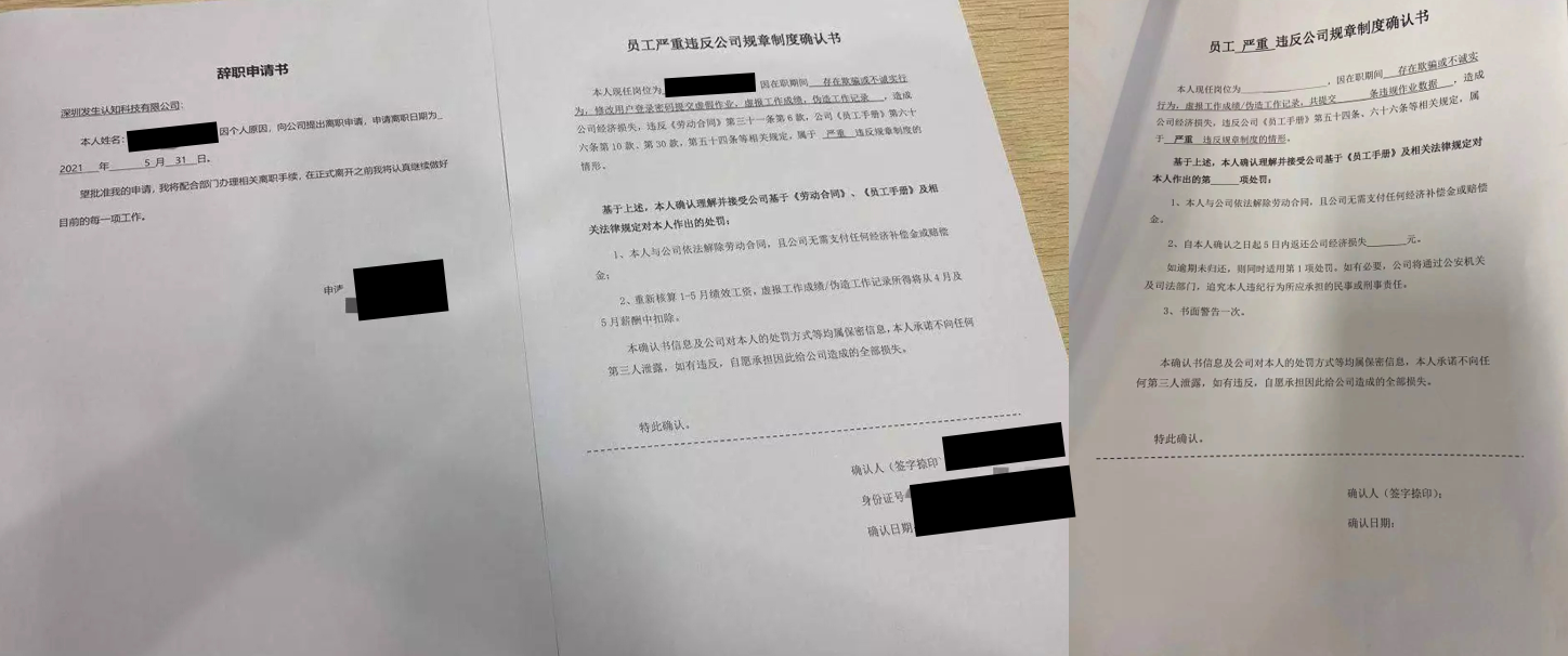 小A向界面教育记者出示了本人和小火箭部门一位离职员工被迫签署的违规确认书,确认书中明确写道:“本人与公司依法解除劳动合同,且公司无需支付任何经济补偿金或赔偿金。重新核算1-5月绩效工资,虚报工作成绩/伪造工作记录所得将从4月及5月薪酬中扣除/自本人确认之日起5日内返还公司经济损失__元……”