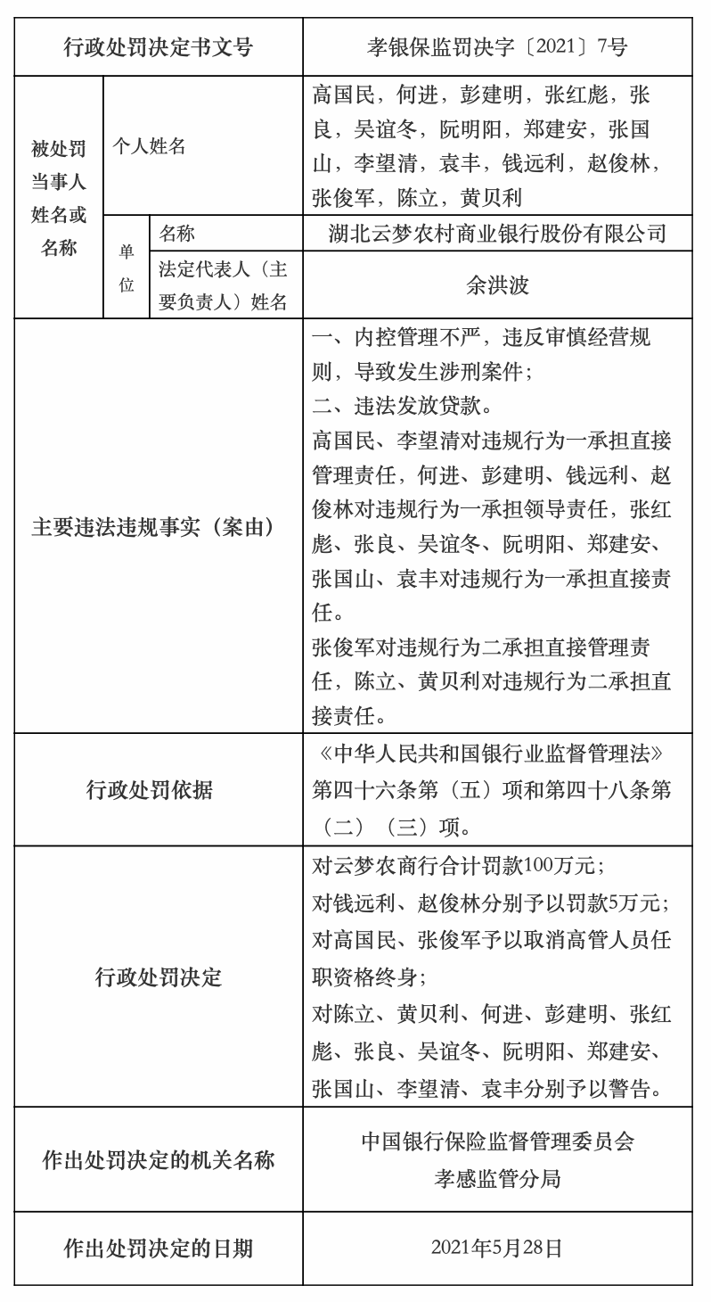 中国银行保险监督管理委员会孝感监管分局对钱远利、赵俊林分别予以罚款5万元,对高国民、张俊军予以取消高管人员任职资格终身,对陈立、黄贝利、何进、彭建明、张红彪、张良、吴谊冬、阮明阳、郑建安、张国山、李望清、袁丰分别予以警告。