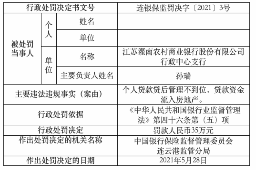 银保监会官网6月4日消息,连云港银保监分局发布的行政处罚信息公开表显示,江苏灌南农村商业银行股份有限公司行政中心支行因个人贷款贷后管理不到位,贷款资金流入房地产,被中国银行保险监督管理委员会连云港监管分局罚款人民币35万元。