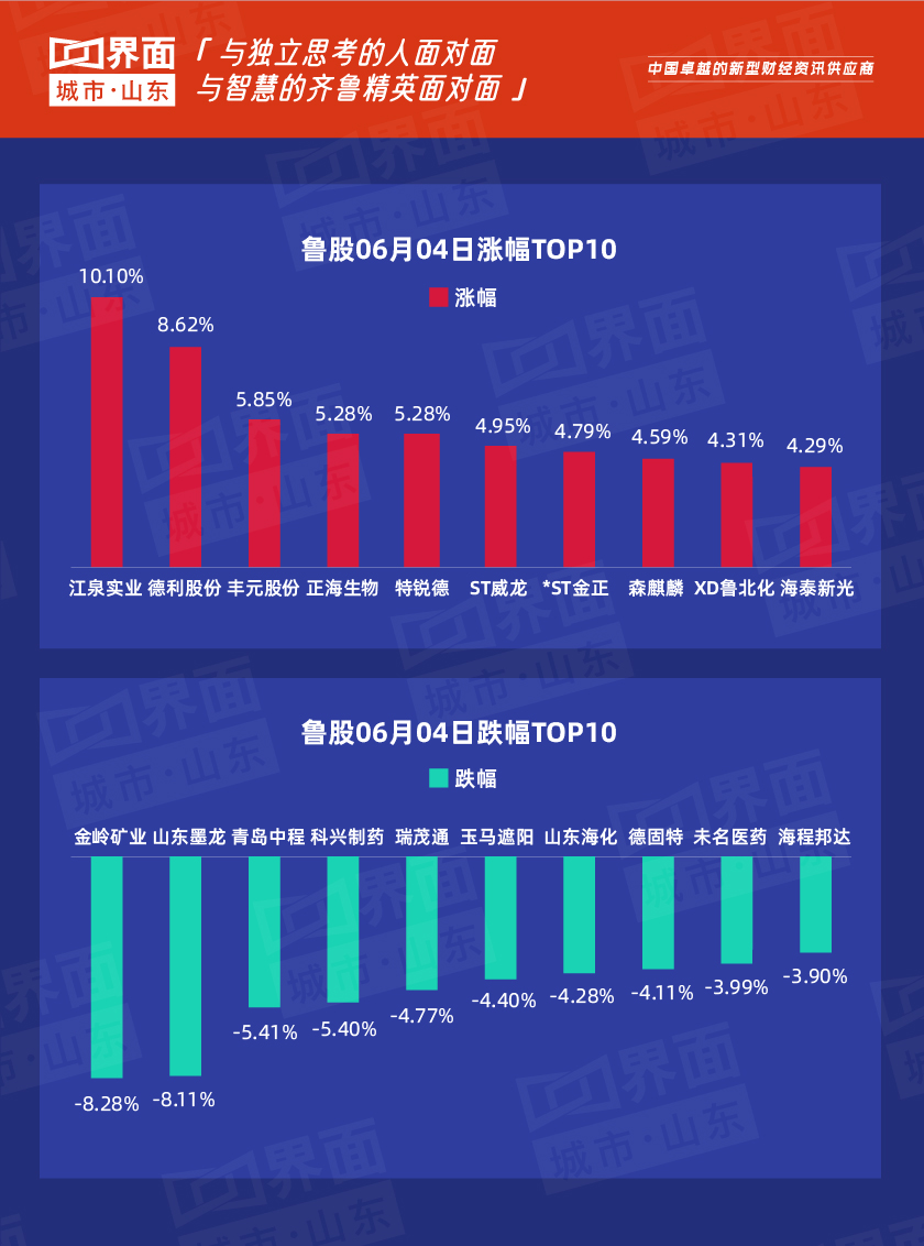 受大盘影响,6月4日,山东省内沪深股票有105只个股上涨,122只下跌,江泉实业领涨。