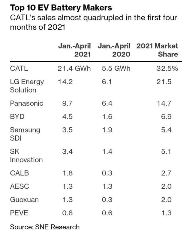图注:SNE Research 2021年前四个月全球电池装机量数据 图片来源:SNE Research