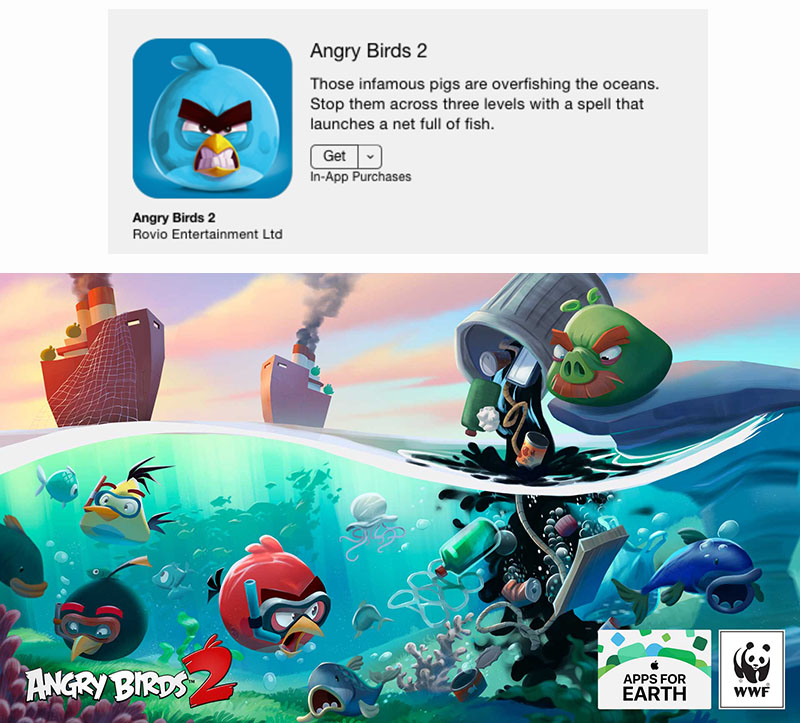 这次“Apps for Earth”活动中,愤怒的小鸟把图标改成了海洋蓝。并推出了新的游戏环节——“和愤怒的小鸟一起保护海洋”。场景设置在海上,愤怒的小鸟为阻止滥捕、拯救被抓起来的海洋生物而作战,以此提醒人们海洋资源的枯竭。