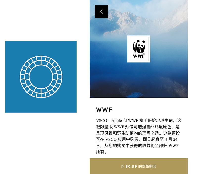 热门修图软件 VSCO 推出了一款新的付费滤镜预设,名为“WWF”,主要是加强照片的颜色,同时让光线上更贴近自然的设定,很适合调整风景和野生动物照片。在活动期间为了增强用户的关注,VSCO 的图标会暂时变成蓝色。