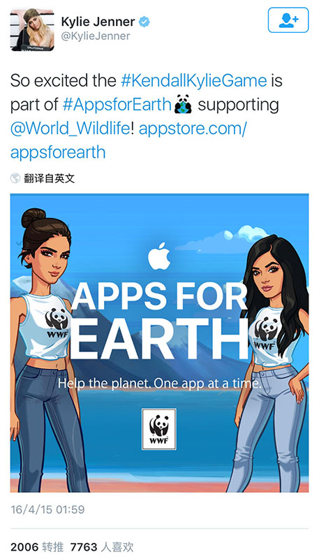 这个“Apps for Earth”的活动已于4月14日晚在苹果美国商店上线,将会持续到4月24日。国际名模 Karlie Jenner也发Twitter宣传“Apps for Earth”。用名人发推文的形式扩大活动影响范围是个不错的选择。