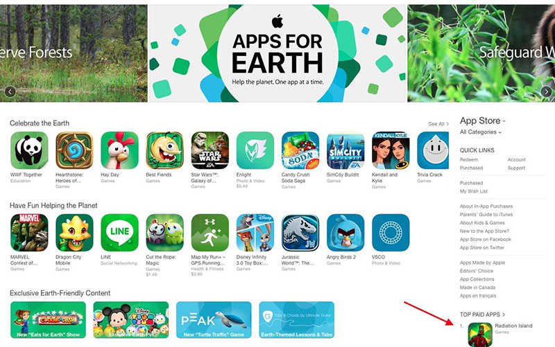除了Logo变化外,苹果还与世界自然基金会(WWF)合作,为世界地球日量身定做了“Apps for Earth”专区,并放在最引人注目的区域。当然,它们还是你平时熟悉的那些热门应用,只是也都变成了绿色。这些平时的热门应用都相应了