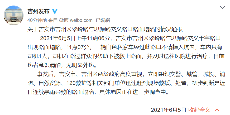 事发后,吉安市、吉州区两级政府高度重视,立即组织交警、城管、城投、消防、自然资源、120救护等相关部门单位迅速赶到现场救援、处置。初步判断是近日连续暴雨导致的路面塌陷,具体原因正在进一步调查中。