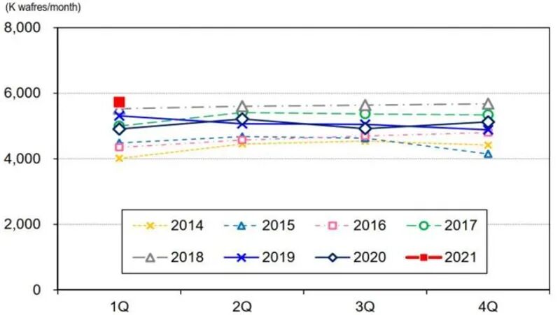 下游晶圆产能紧张局面有望传导至硅片端,根据国际半导体产业协会(SEMI)统计数据,2021Q1 全球硅晶圆出货面积 3337 百万平方英寸,环比增长 4%,同比增长 14%,晶圆出货面积验证行业高景气得以延续。