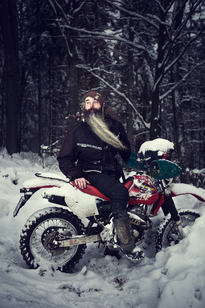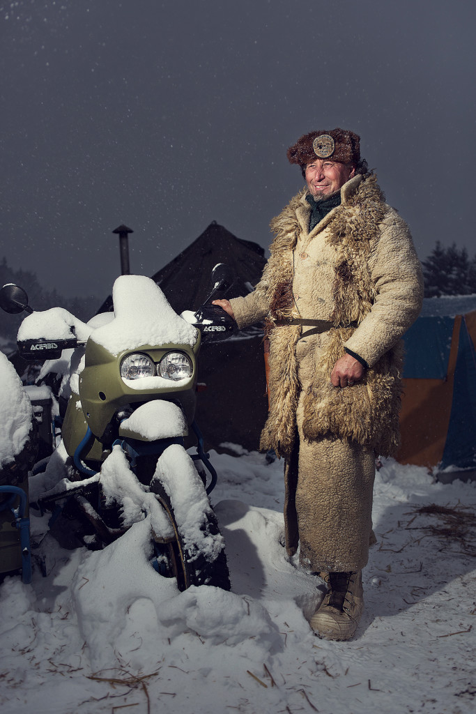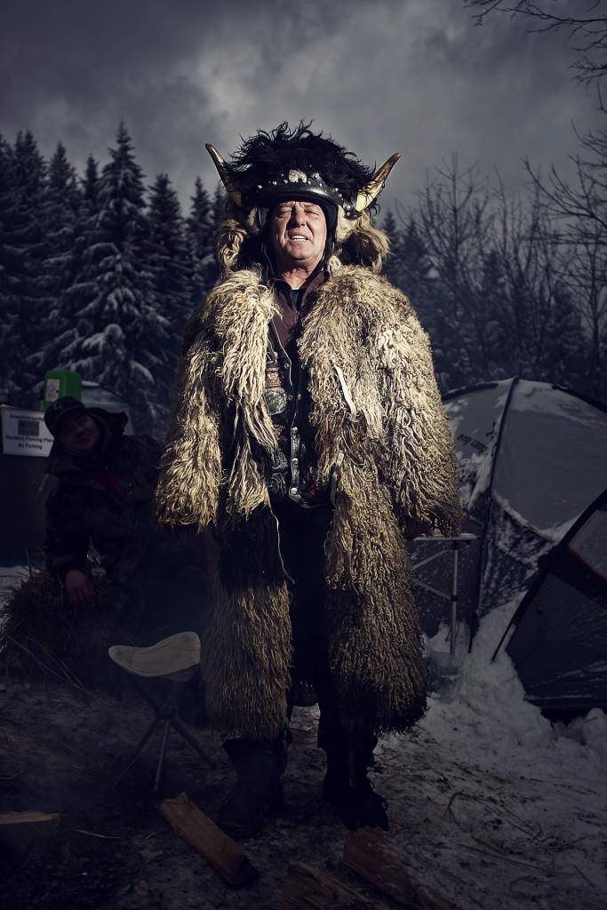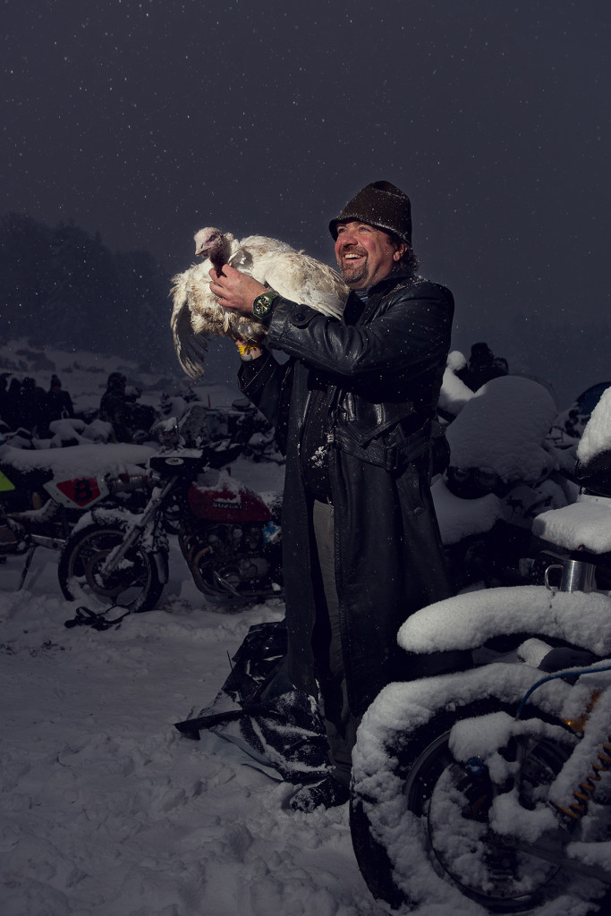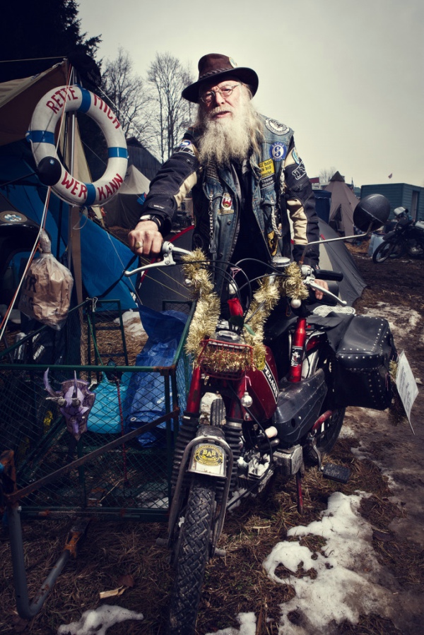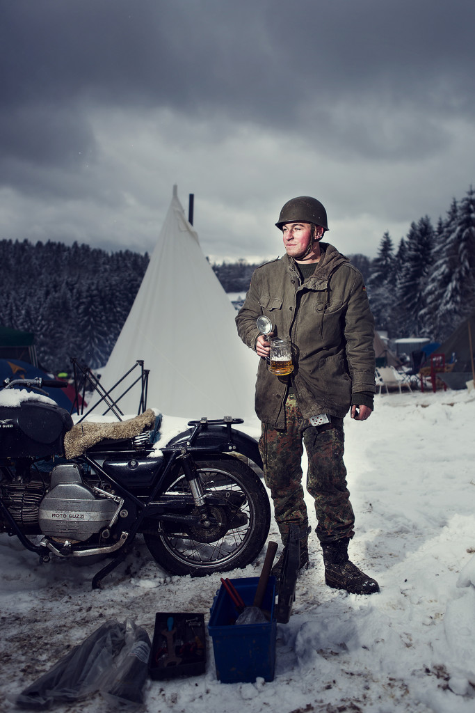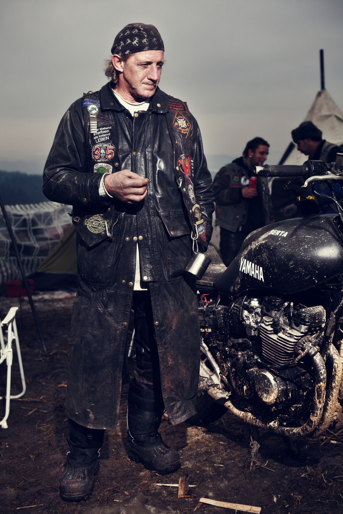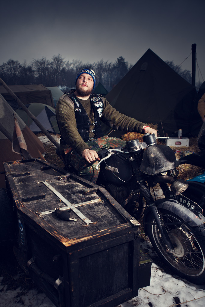 D'Angelo第一次参加活动是在2014年,他当时从意大利中部的家乡小镇出发,先是开车,接着搭了两趟火车,再转大巴,最后搭了一辆货车的顺风车才抵达图尔曼斯邦,一座位于巴伐利亚森林边缘的小城。从小城出发,他往冰雪覆盖的森林里走了接近5英里,一路上看到好几辆载满行李的摩托车呼啸而过。正当他发觉自己迷路了的时候,他听到远处隐约有引擎的咆哮声。于是他继续踏雪前行。“终于我看到前方有一个山谷:到处都停的是摩托车,人们抱着一摞摞柴火,四处都扎满了帐篷,还有数以百计的营火,空气中满是欢乐的气氛。他说,“现在该拍照片了。”