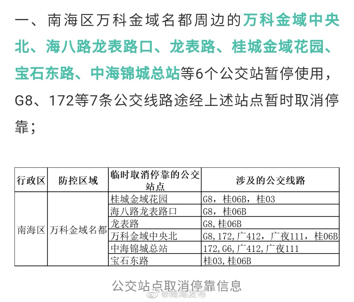 @南海发布 微博6月6日消息,根据佛山市疫情分级分类防控要求,为配合做好本轮新冠肺炎疫情防控工作,今起,对部分公交线路进行临时调整: