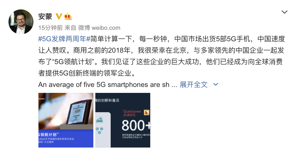 6月6日消息,在中国5G商用牌照发放2周年之际,高通公司总裁兼候任CEO安蒙(Cristiano Amon)在其个人微博发文称,“简单计算一下,每一秒钟,中国市场出货5部5G手机,中国速度让人赞叹。”
