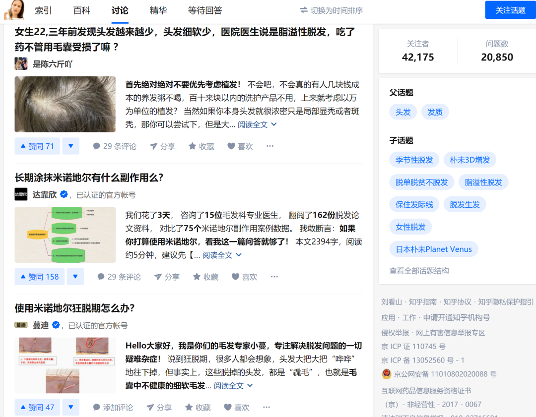以知乎为例,在关注量超过4W、提问数超过2W的“脱发”话题页里,热门推荐位的内容基本都来自于机构蓝V。点赞数较高的UGC内容(例如知乎网友固力果的《生发干货 亲测有效【脱发者的自我救赎】》,获赞1.5W)也基本可以归纳为治疗方案推荐(药物、治疗机构)、解决方案推荐(发型、假发)两种。