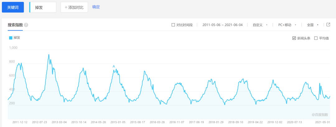 百度指数也显示,人们会对掉发呈现出一种有季节规律的担心——9月份“掉发”的搜索达到峰值后逐渐回落,在第二年9月又重回峰值,但人们似乎也逐渐放任自流了,对掉发的担心从2011年到现在逐渐波动下降。只有在“植发”、“假发”等解决办法的出现后,才能刺激一下已经经历了长久脱发的疲惫的神经。