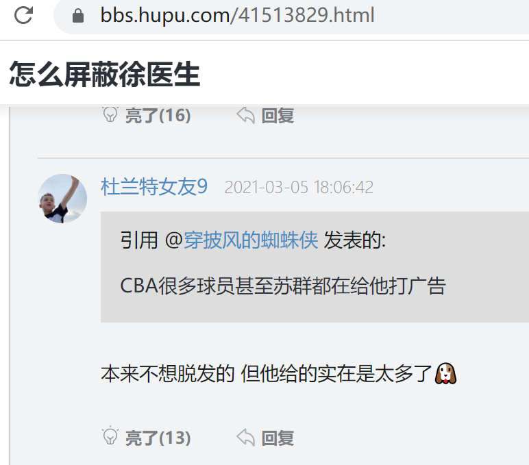 并且转化率相当惊人,虎扑上就有个经典的例子:有人在步行街问“各位jrs,脱发到底还有没有啥方法能救啊”,最高亮答案是“一会儿徐大夫就过来了”——“徐大夫”是步行街知名投放广告“毛发医生徐鲁”的简称,因为过于密集和恶心(主要是裸露的头皮)被逐渐“梗化”——JRs们曾经发帖专门讨论过“如何在信息流里屏蔽徐大夫”,大家一对才发现好家伙,原来知名解说、CBA球员都代言过,这到底有多赚钱?