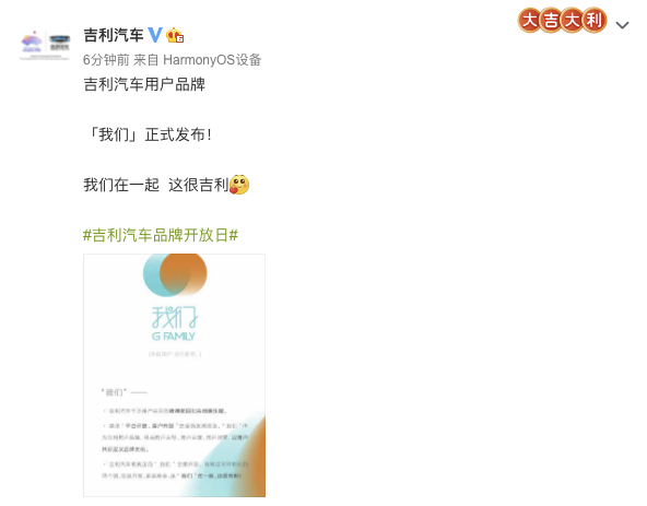 @吉利汽车 微博消息,6月6日,吉利汽车用户品牌“我们”正式发布。据介绍,“我们”将由用户主导、用户主理、用户运营。