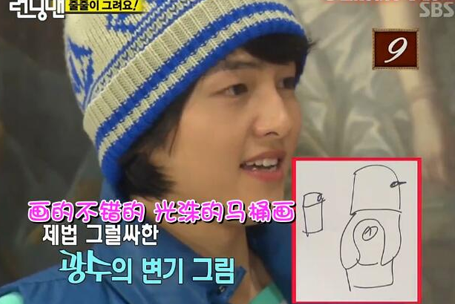 在绘画接龙猜词环节,要根据上一个人的画,快速画出形象传递下去。上一个是光洙的画,还能看出是个马桶↓↓↓