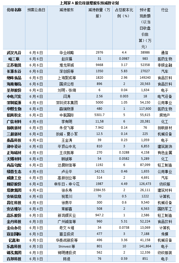 上周(5月31日至6月6日),据界面新闻不完全统计,共有72家A股公司发布股东预减持计划。