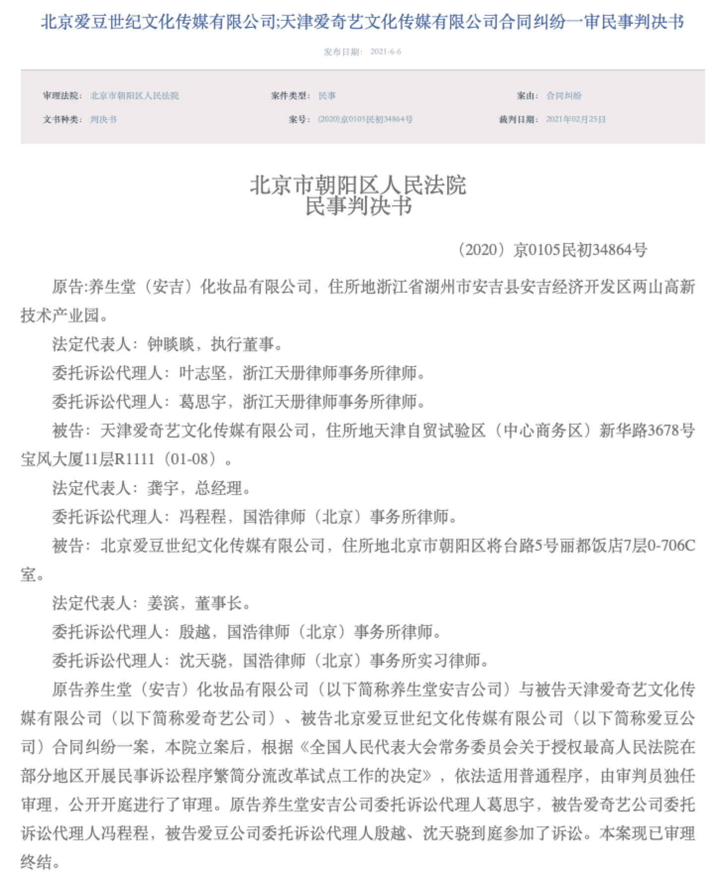 据天眼查APP显示,近日,北京爱豆世纪文化传媒有限公司、天津爱奇艺文化传媒有限公司合同纠纷一审民事判决书公开,案号(2020)京0105民初34864号,审理法院为北京市朝阳区人民法院。原告为养生堂(安吉)化妆品有限公司,被告为天津爱奇艺文化传媒有限公司、北京爱豆世纪文化传媒有限公司。该案涉及蔡徐坤广告代言纠纷。