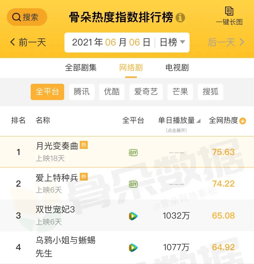 编辑与作者的恋爱仿佛格外“香”,既是工作上的伙伴又是生活中的伴侣,这届观众似乎发现了职场恋爱的魅力。5月20日播出的《月光变奏曲》目前在骨朵热度指数排行榜上仍居首位。#月光变奏曲#官方微博中有关虞书欣、丁禹兮的个人话题超过5个,其中#虞书欣月光变奏曲#微博话题阅读量已达到10.3亿,与官方微博话题15亿的阅读量不相上下。剧集播出期间,虞书欣、丁禹兮分别位列骨朵艺人榜top1和top4,无疑也证明了该剧的热度。