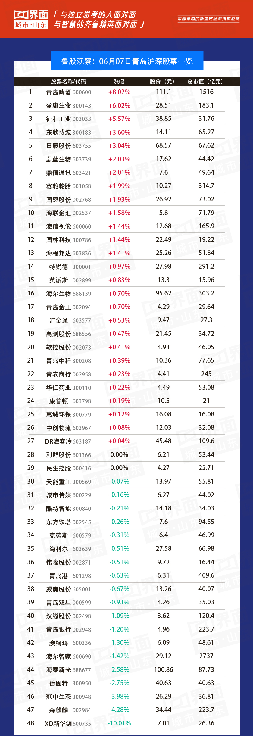 总市值过千亿的有万华化学(600309)、海尔智家(600690)、潍柴动力(000338)、青岛啤酒(600600)、歌尔股份(002241)、华熙生物(688363)、中航沈飞(600760)共7家。