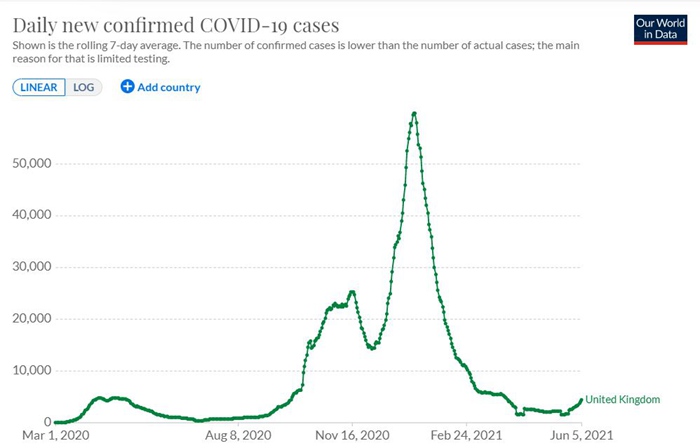 从5月20日起,英国单日新增确诊就开始上涨,从1522例涨至6日的5341例。英国最近七天确诊病例较过去七天增加了11022例,约49%。