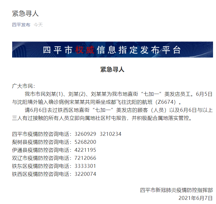 据“四平发布”微信公众号6月7日消息,吉林四平市新冠肺炎疫情防控指挥部发布公告紧急寻人,四平市市民刘某(1)、刘某(2)、刘某某为四平市地直街“七加一”美发店员工。6月5日与沈阳境外输入确诊病例宋某某共同乘坐成都飞往沈阳的航班(Z6674)。请6月6日去过铁西区地直街“七加一”美发店的顾客(人员)以及6月6日与以上三人有过接触的所有人员立即向属地社区村屯报告,并积极配合属地落实管控。