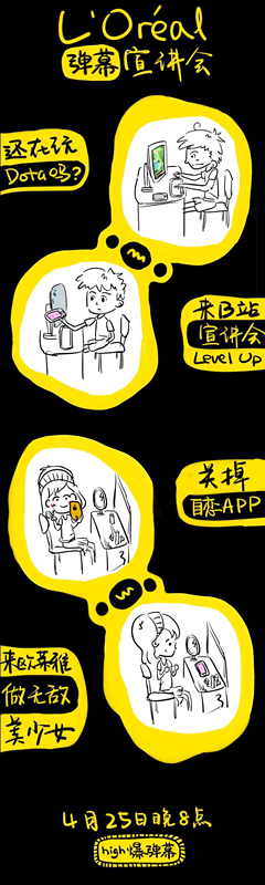 在宣讲会的前一周,欧莱雅还特地制作了针对B站二次元们的海报。在黑底黄边、还配上了4幅简笔漫画的宣传海报上,他们这样写道:“还在玩Dota吗?来B站宣讲会Level Up;关掉自恋-App,来欧莱雅做无敌美少女。”