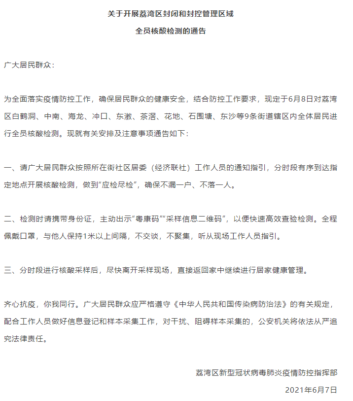 据“广州荔湾发布”微信公众号6月7日消息,广州荔湾发布关于开展荔湾区封闭和封控管理区域全员核酸检测的通告,定于6月8日对荔湾区白鹤洞、中南、海龙、冲口、东漖、茶滘、花地、石围塘、东沙等9条街道辖区内全体居民进行全员核酸检测。
