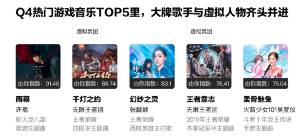 由你音乐榜所发布的《2019Q4华语数字音乐行业季度报告》显示,可以看到Q4热门游戏音乐TOP5里,王者无限团所演唱的《千灯之约》和《王者意志》双双上榜,与许嵩、张靓颖等传统流行歌手齐头并进。在《王者荣耀》五周年线下音乐会上,无限王者团与明星宋茜合作的舞台表演了《镜城》,将线上的繁荣延续到了线下。