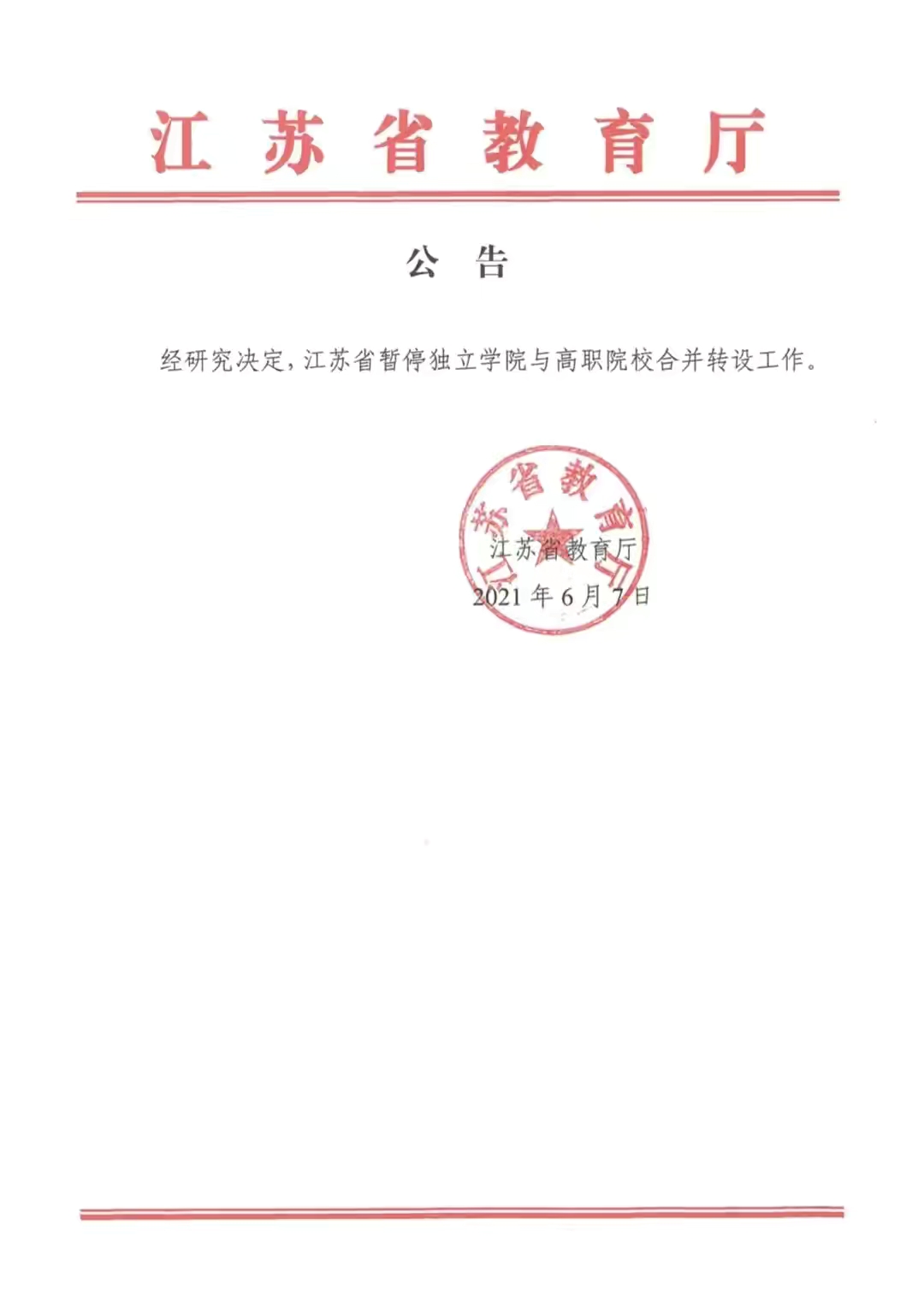 6月7日晚间消息,江苏省教育厅发布公告:经研究决定,江苏省暂停独立学院与高职院校合并转设工作。
