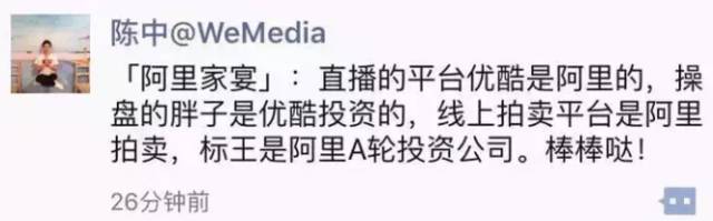 当然,也有人换个角度来扒。拍卖的线上平台是阿里的,线上直播是优酷的,投资罗振宇的是优酷,而优酷又是阿里的。甚至标王丽人丽妆都是阿里投资的公司。难怪网友会说这是一场“阿里的家宴”。