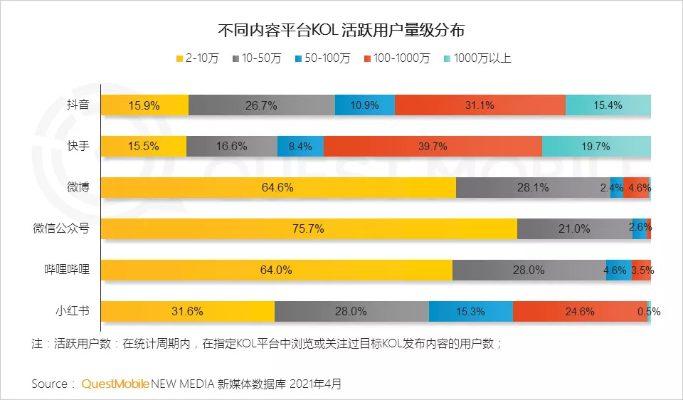 2.2 抖音、快手活跃用户数在百万级以上的KOL数量占比最高,其他平台KOL主要以十万量级为主,其中微博、微信公众号、哔哩哔哩2-10万的KOL占比超六成