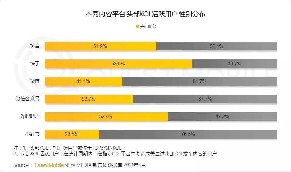 3.2 微博、小红书头部KOL更受女性用户关注,其他平台男女性别比例较为均衡