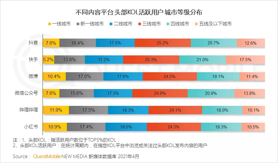3.4 各平台头部KOL用户地域分布差别不大,快手和微信公众号在四线及以下城市影响力较强