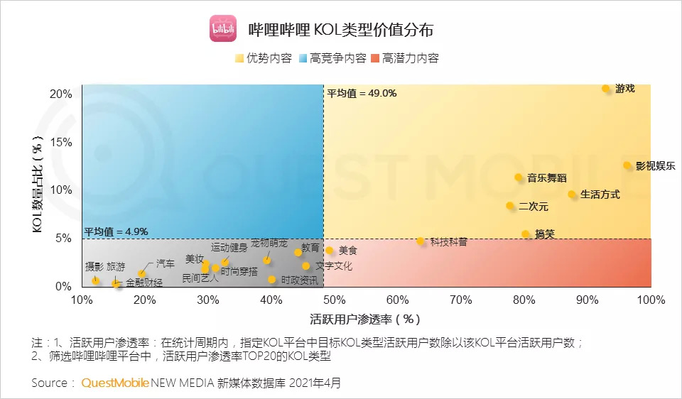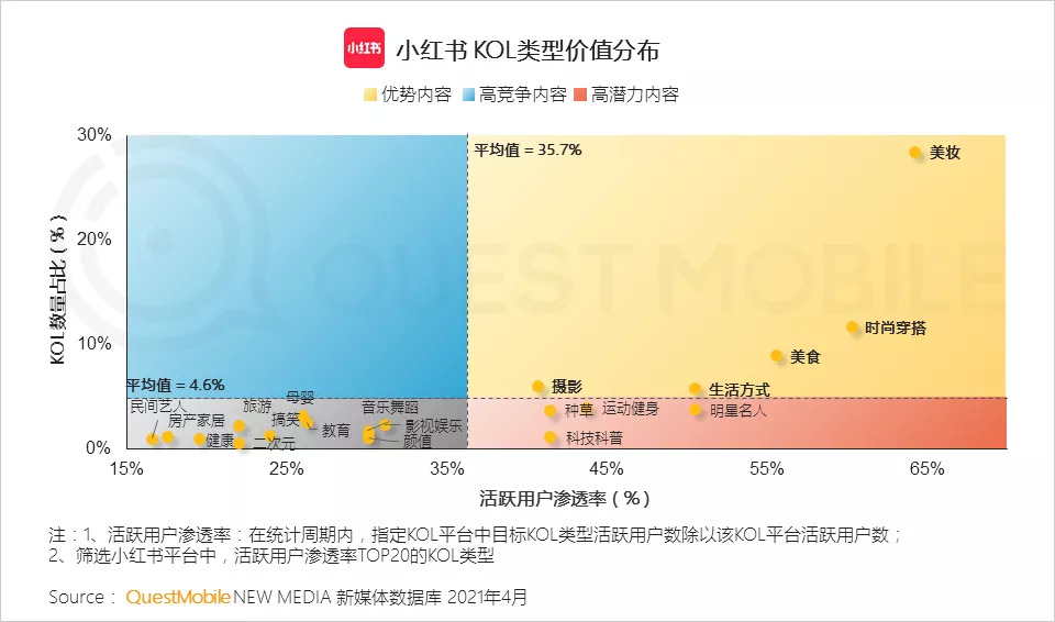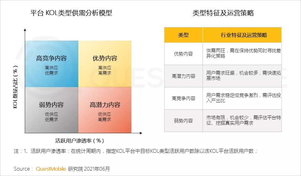 1、平台内容供需分析模型:根据KOL数量及其活跃用户渗透率分布判断内容供需情况,分析市场竞争环境及运营策略