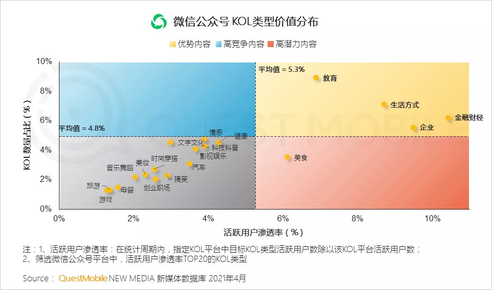 6、微信公众号平台中,泛娱乐类内容较为弱势,文字深度影响用户的教育、金融财经类KOL发展良好